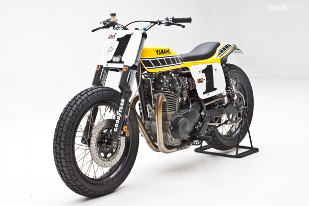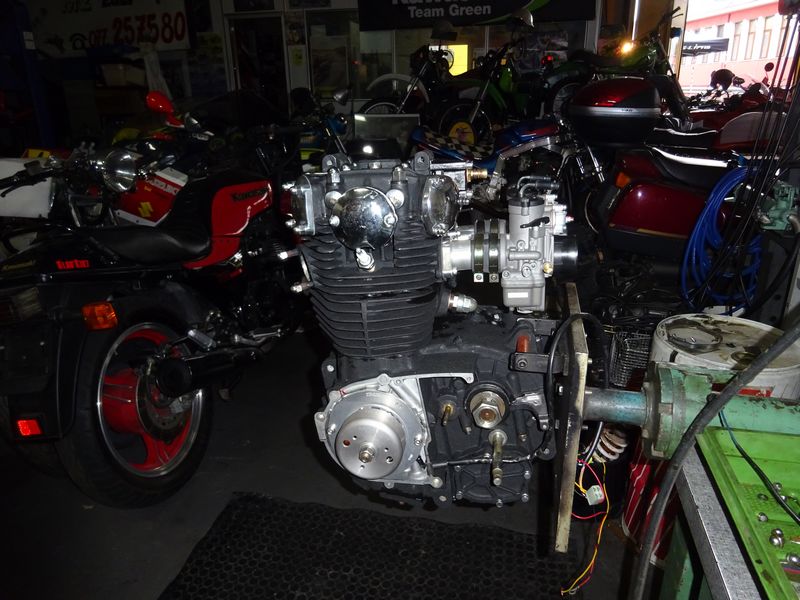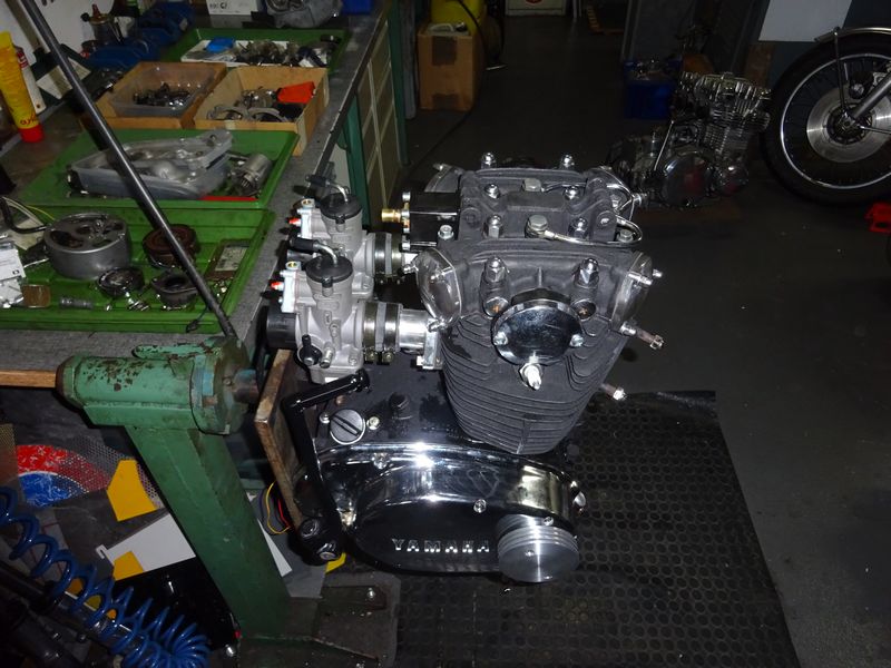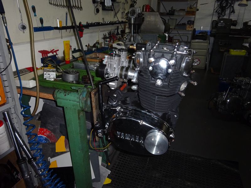Sur la base du moteur de Yamaha XS 650 des années 70, porté à 750, révisé à neuf, avec allumage électronique et carburateur Dellorto de 36, à pompe de reprise.